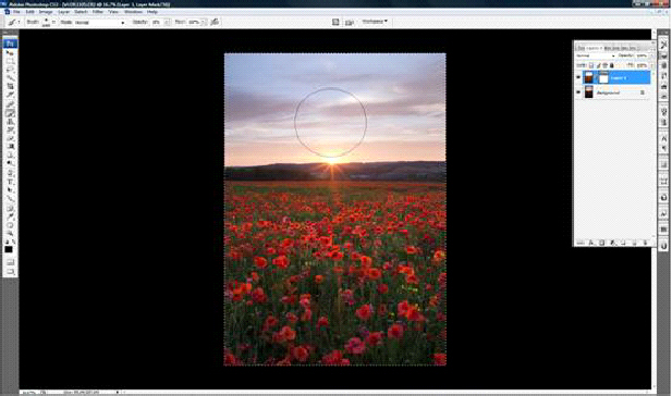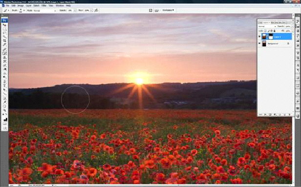 Then select the brush tool. Adjust the brush settings to: opacity 15% flow 100%. The brush size should be about ½ to 1/3 of the sky area. Make sure the foreground colour is black. Hold down the left mouse button, drag and paint in the new sky. In the layers palette you will see the darkening of the mask. This indicates the new sky emerging through the old. A black foreground colour paints in the sky, white removes any areas which may need fine tuning. Perhaps with a smaller brush size around awkward areas.