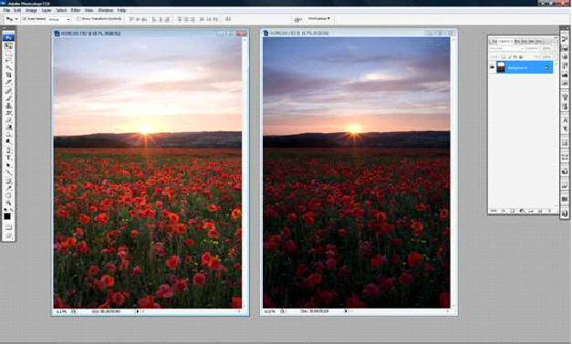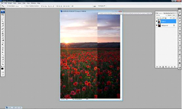 Using the move tool, drag the lighter image into the dark image. This will create a new layer in the layers palette. Select all and align images horizontally and vertically.