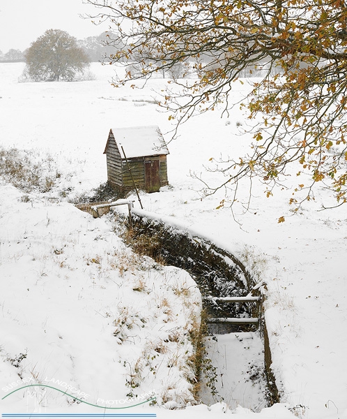 Description: Taken during the heavy snow fall of December 2010, this old hut stands along the sluice from knepp Castle Lake. Under the ice and snow, a new Eel trap is in place ready for the draining of the lake at some point.